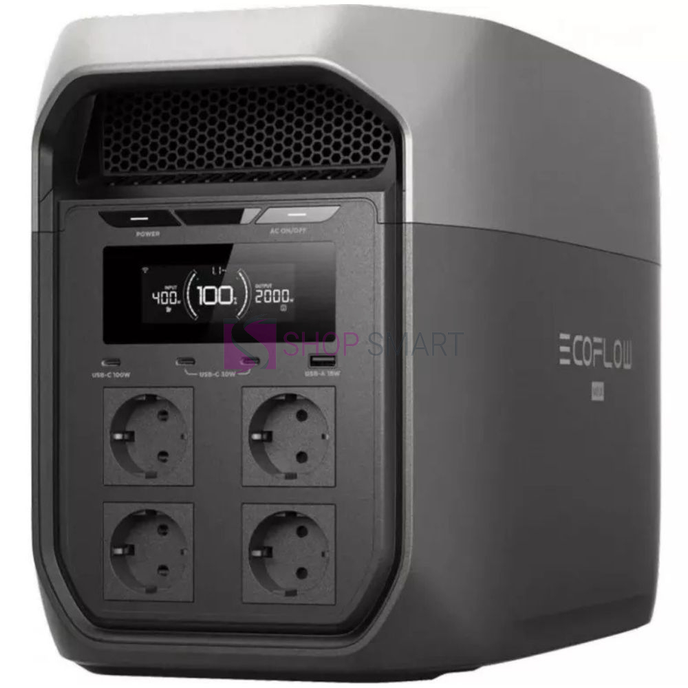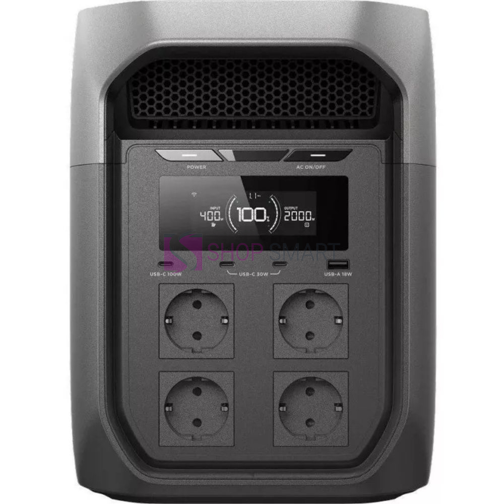 Місткість 2048 Вт*год ; Порти для заряду: Розетка x4, USB-A 18W x1, USB-C 100W x1, USB-C 30W x2, Автомобільна розетка x1 ; Загальна потужність 2400Вт (Surge 4800Вт) ; Акумулятор LFP ; Швидка зарядка: 100% за 68 хвилин (від розетки 2300W) ; Дистанційне керування через програму EcoFlow ; Габарити: 494 x 239 x 305 мм, 20.3 кг; Чорний з сірим; Розетка EU.